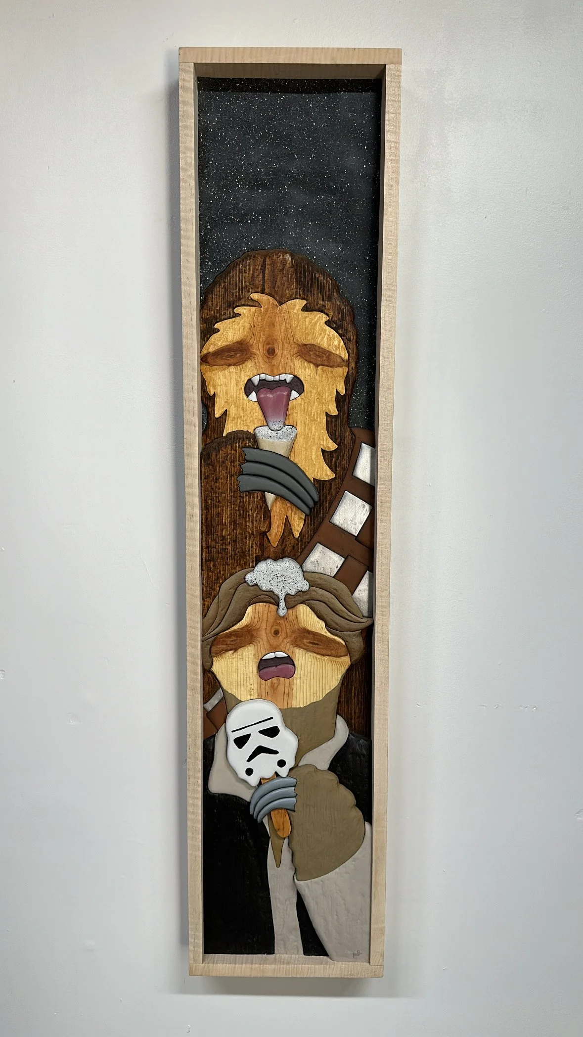 Materials: Douglas Fir wood, Curly Maple hardwood (frame), wood glue, acrylic paint, wood stain